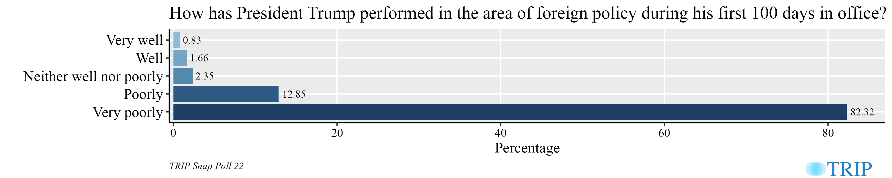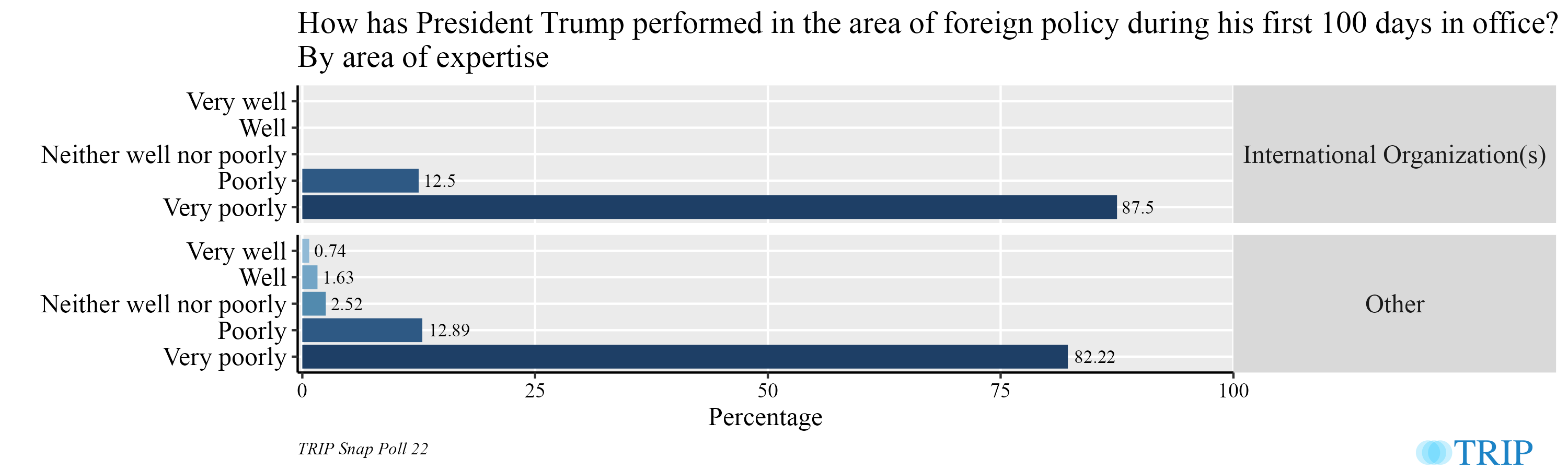 Scholars of international organizations overwhelmingly evaluated President Trump’s foreign policy within his first 100 days as negative, and they did so at consistently higher rates than the broader community of international relations scholars. These findings suggest experts viewed Trump’s early actions as damaging to the international order. The international order often hinges on support for institutions’ rules and cooperative frameworks; for example, withdrawals from agreements such as the Paris Climate Accord or threats to NATO’s defense commitments can erode these rules.