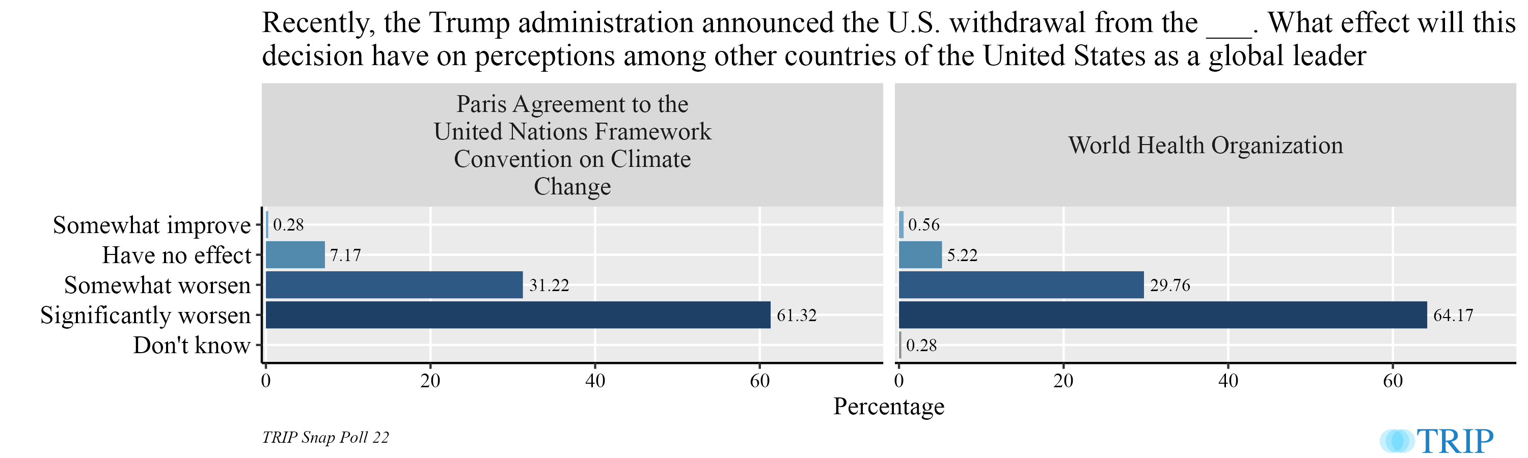 On the question of how President Trump has performed in the area of foreign policy during his first 100 days in office, 82.3% of scholars rated the president “very poorly.” Additionally, 95.7% of scholars said that compared with the past, the United States is less respected by other countries today. Sixty-one percent of scholars said President Trump’s withdrawal from the Paris Agreement to the United Nations Framework Convention on Climate Change would significantly worsen perceptions among other countries of the United States as a global leader, and 64% of scholars said the same of President Trump’s withdrawal from the World Health Organization. Higher disapproval rates suggest a deeper understanding of the dangers of eroding norm-based institutions such as international organizations, which do not have a basis in binding law and rely on the willful participation and support of their member states.