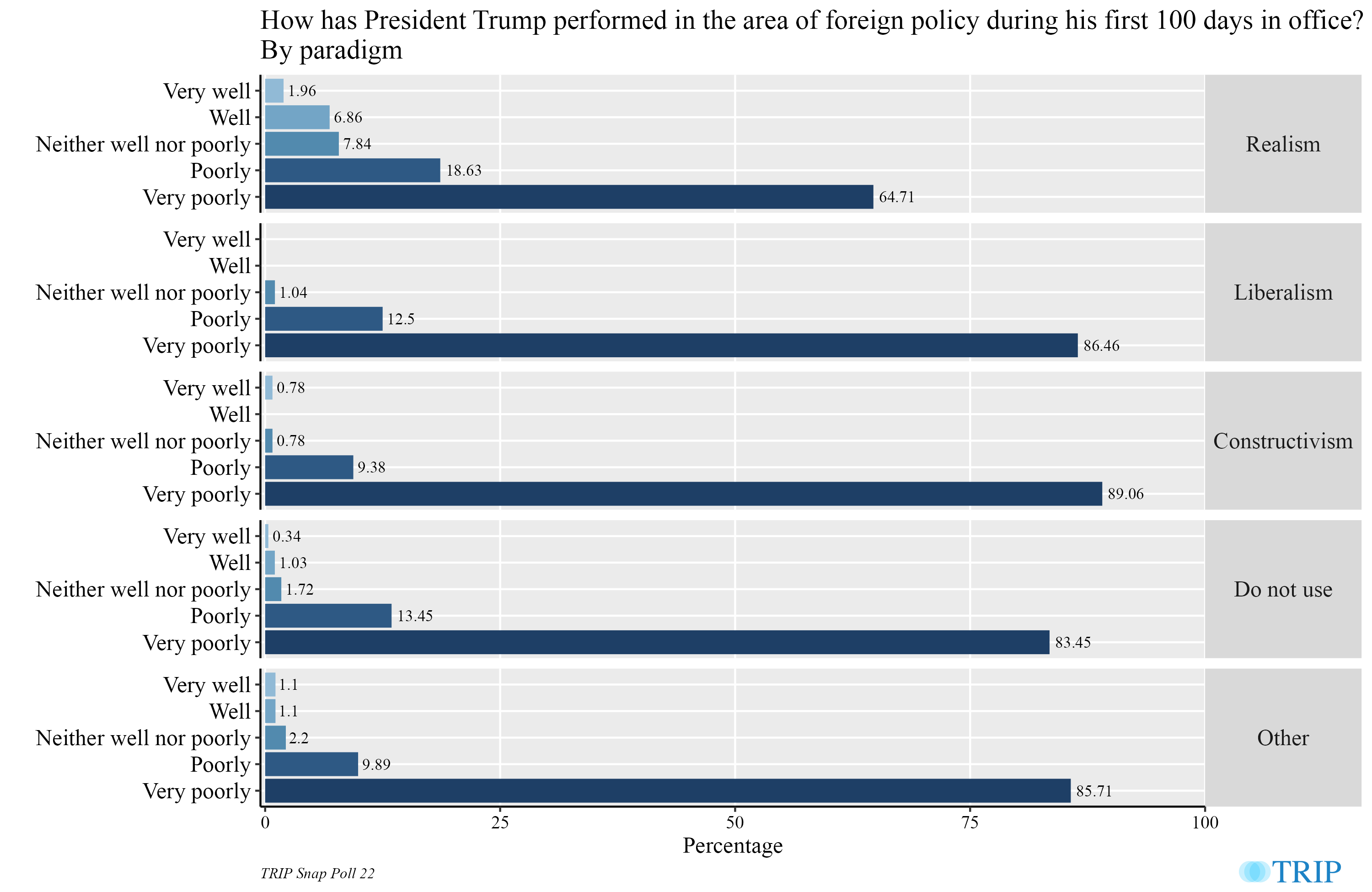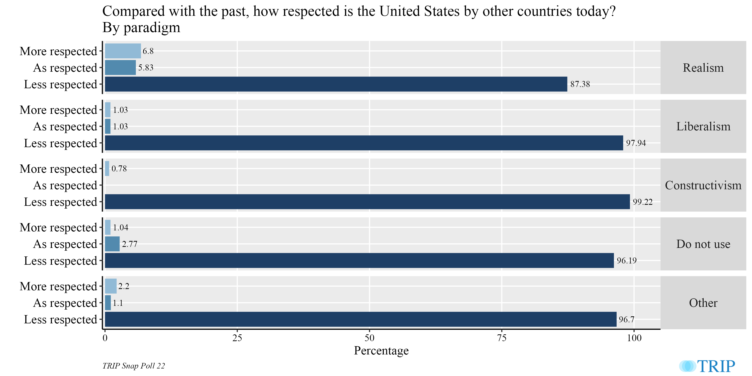 On the question of how President Trump has performed on foreign policy in his first 100 days in office, realists evaluated his performance “very poorly” at 64.7%, whereas liberals responded “very poorly” at 86.46%, constructivist 89%, and those who did not use a paradigm at 83.5%. On America’s respect in the world, 87.4% of realists said America was less respected today, compared with 97.9% of liberals, 99.2% of constructivists, and 96.2% of those who do not use a paradigm.