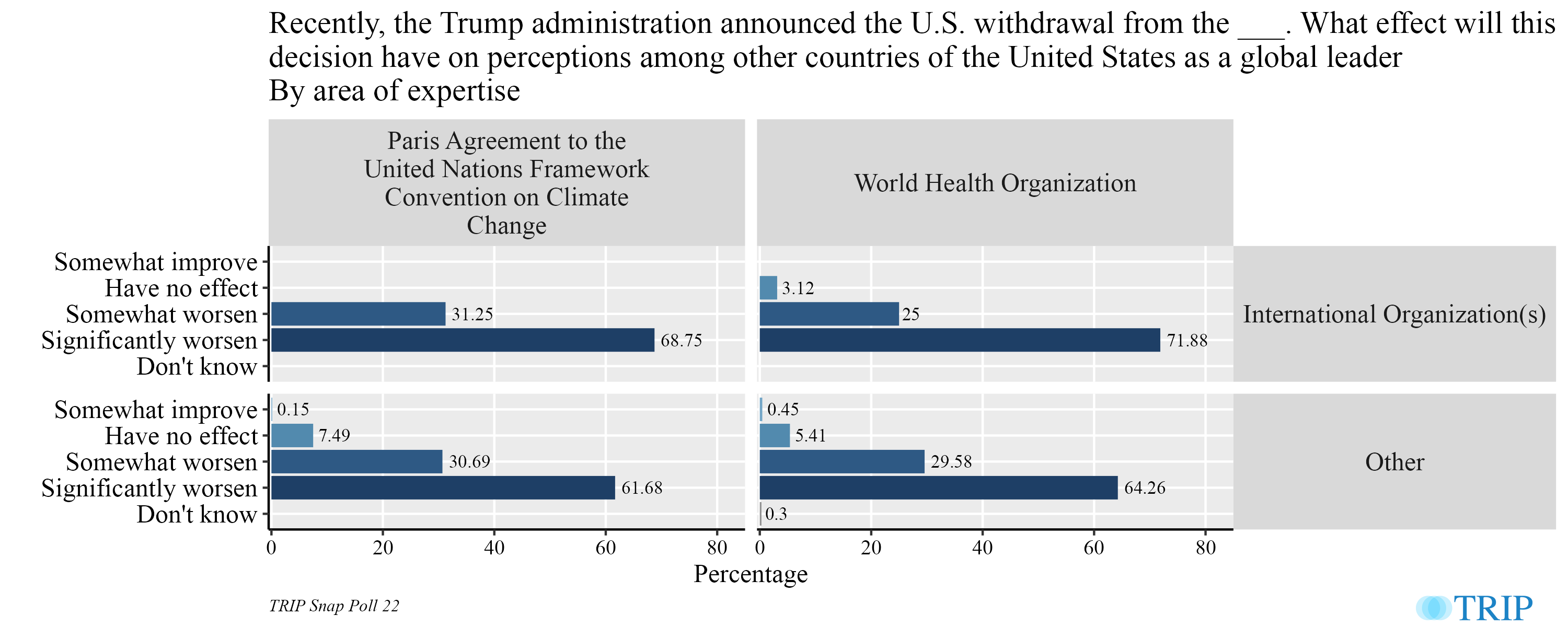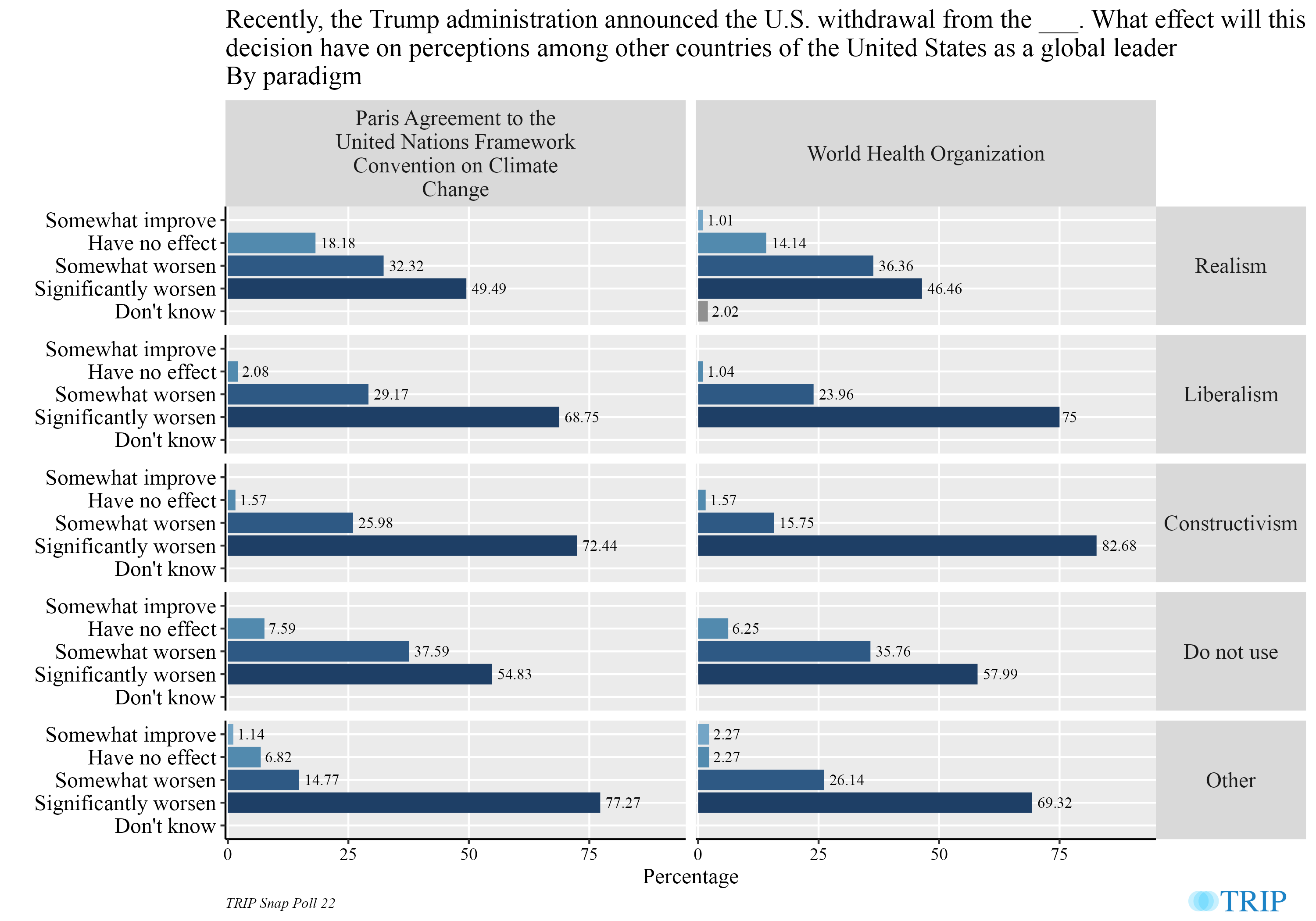 IO scholars also evaluated President Trump’s stance on the Paris Climate agreement more harshly; sixty-eight percent said the withdrawal would significantly worsen American perceptions abroad, and 71.9% of IO scholars said the same of President Trump’s withdrawal from the WHO. These results suggest that both paradigm and specialization strongly color scholars’ perceptions of President Trump’s foreign policies in his first 100 days. Additionally, the data show that IO scholars and non-realist paradigms converge on the view that these policies had disproportionately negative implications for the institutional order.