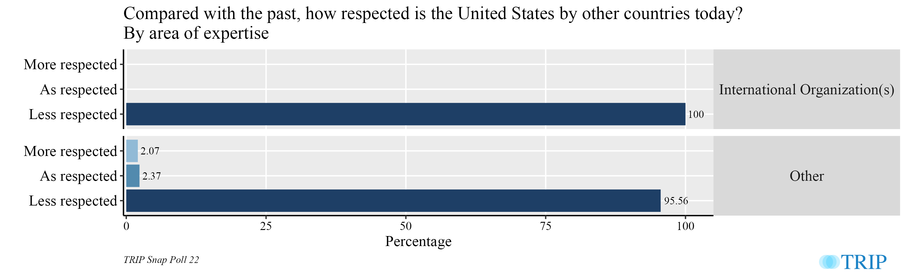 Disapproval is heightened across these same four questions for scholars of international organizations. This reflects the concern that President Trump’s skepticism of international norms presents a structural challenge to the legitimacy and stability of the international institutional system. On the question of how President Trump has performed on foreign policy in his first 100 days in office, scholars of international organizations rated his performance as “very poorly” at 87.5%, compared to 82.2% of all other scholars. One hundred percent of these scholars agree that other countries now respect the United States less than in the past, compared to 95.6% of other scholars.